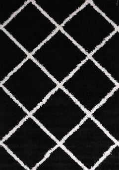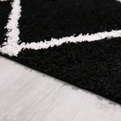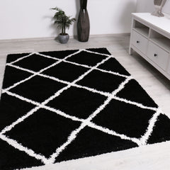 High-pile rug, living room, shaggy diamond pattern, black and cream, Scandinavian design, soft, ethnic