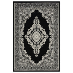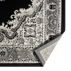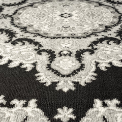 Oriental rug, grey and black, classic ornament, densely woven, short pile, colorfast