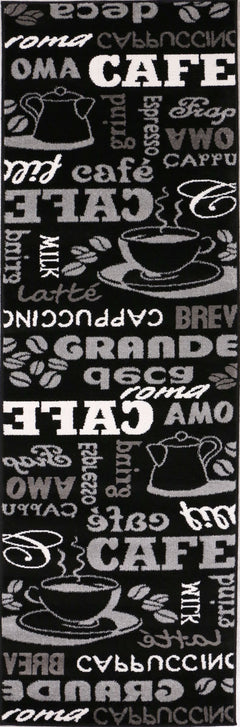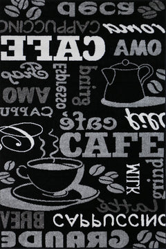Ein vielseitiger Küchenteppich in Schwarz: Unser schwarzer Teppich mit verschiedenen Schriftarten und Mustern (Cappuccino, Kaffe) vereint Stil und Funktionalität. Die warme Farbe fügt sich perfekt in Ihre Küche ein und verleiht einen modernen Touch.